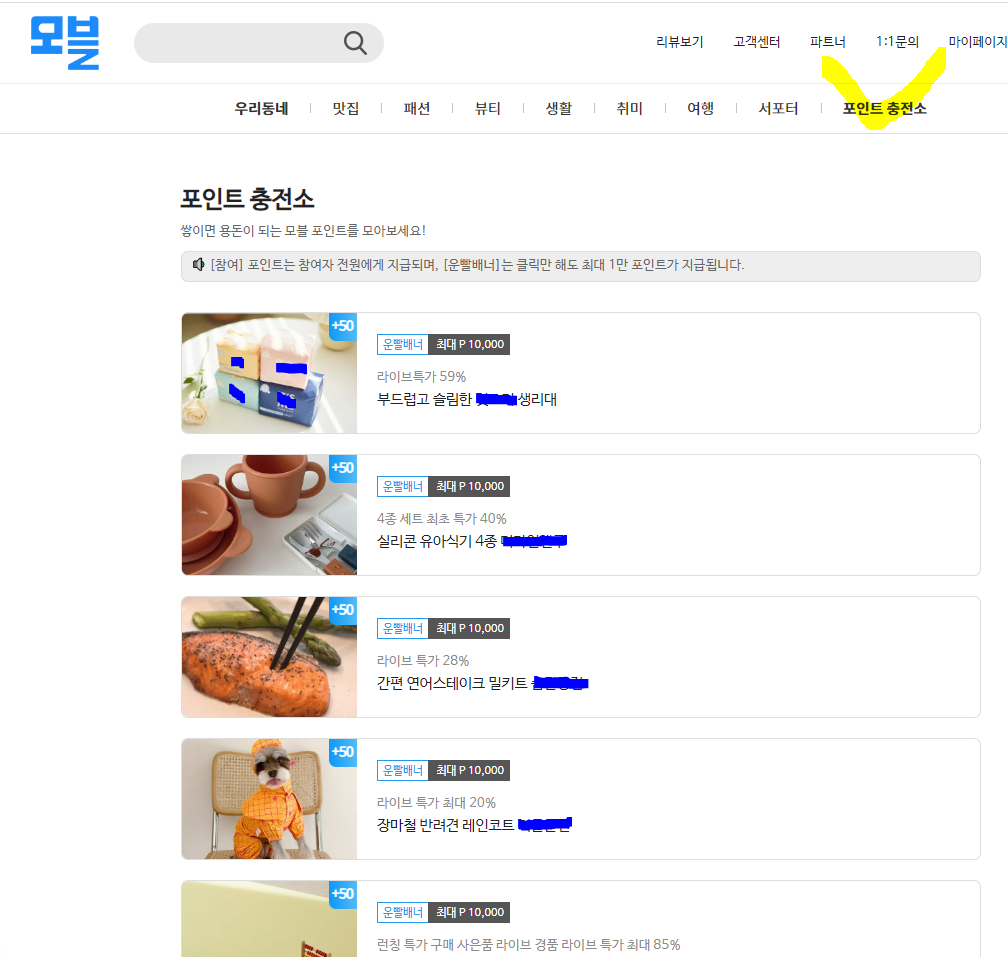 모블에서는 추가로 서포터(기자단)나 이벤트 외에도 '포인트충전소'라는 코너에서도 쉽게 포인트를 받을 수 있어서