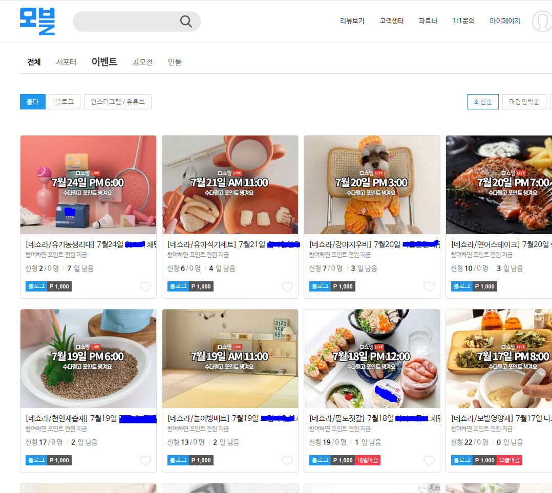 모블에는 기본적으로 동네, 맛집, 패션, 뷰티, 생활 등 다양한 분야로 체험단을 할 수 있는데