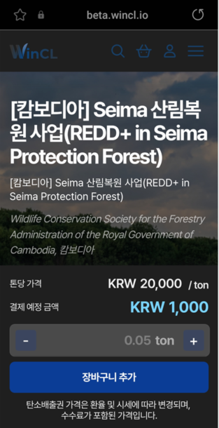 현재 Wincl 마켓플레이스에서 거래되고 있는 탄소배출권 종류는 전 세계적으로 다양한 지원 사업들이 있습니다. 상세보기를 누르면 해당 사업에 대한 설명과 구매할 수 있는 단위와 수량이 보입니다.