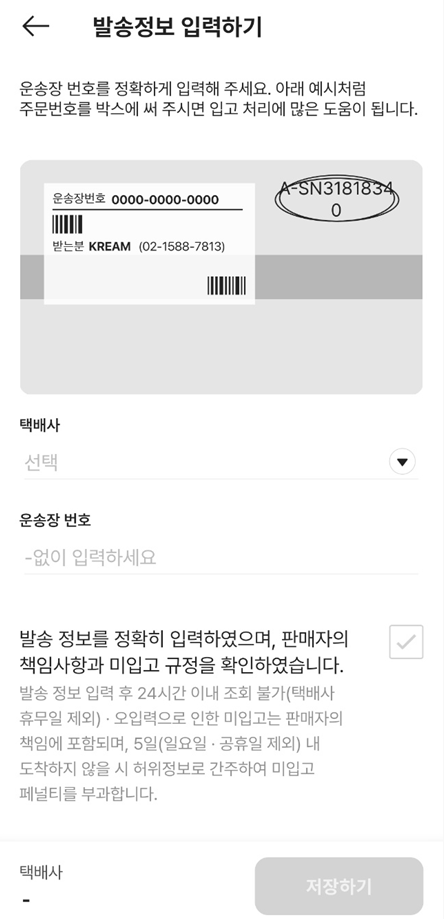 크림 검수장소 주소지로 운동화를 직접 포장 택배를 보내고, 크림 사이트에서 택배 운송장번호를 입력해야 합니다.