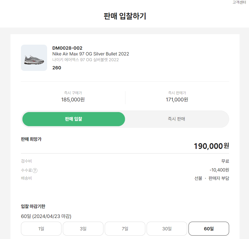 집주소, 나중에 팔리면 정산받을 은행 계좌, 체결되었는데 운동화를 안보내거나 하자가 있는 경우 위약금(벌금)이 결제될 신용카드 등 정보들을 입력하고, 판매하고 싶은 가격과 경매 걸어놓을 기간을 최대 60일까지 걸어놓을 수 있었습니다.