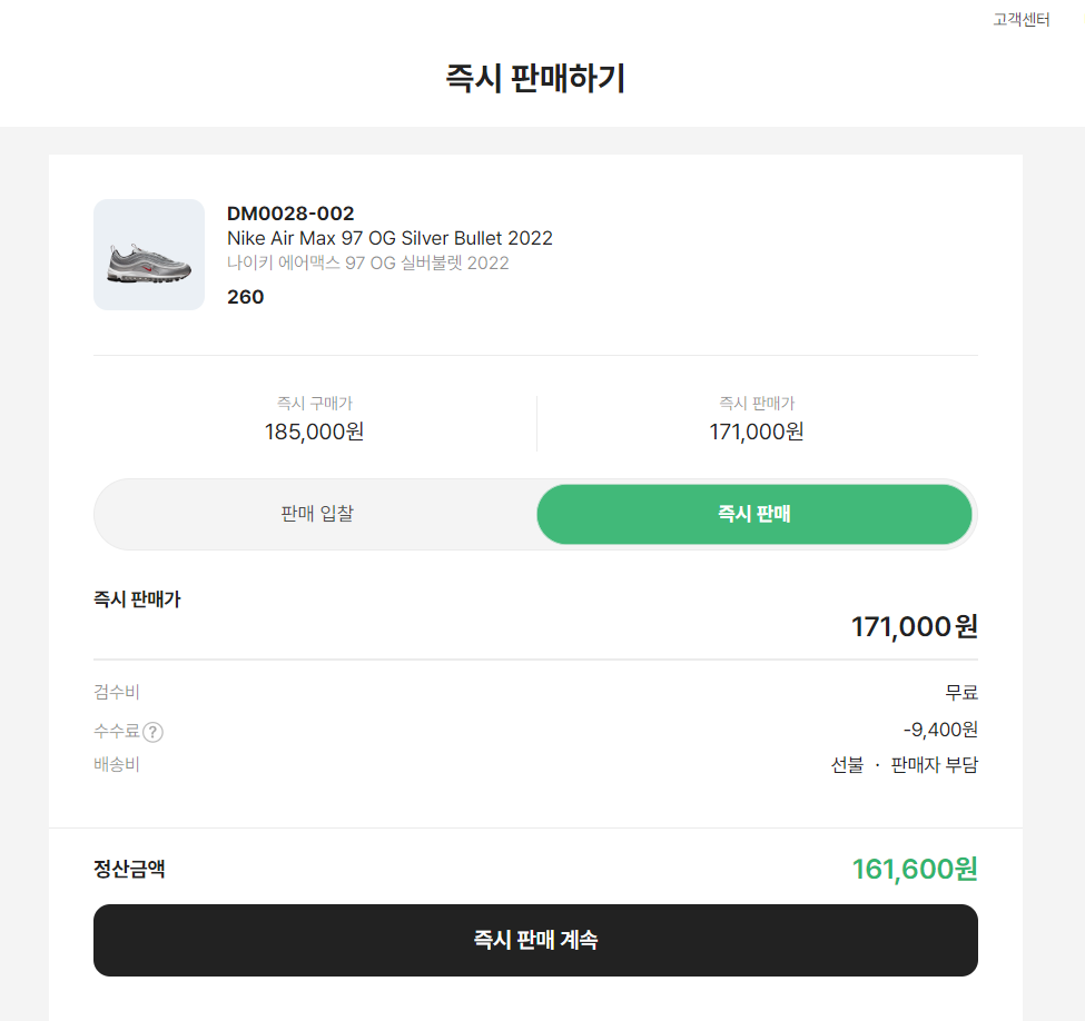 최근 체결된 금액을 기준으로 판단하여 즉시 판매가 아닌 원하는 판매금액으로 걸어놓을 수 있습니다!