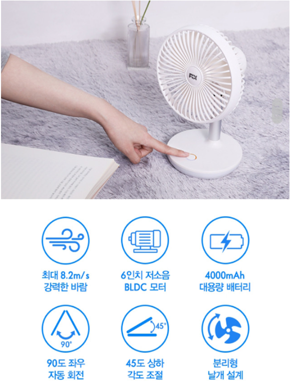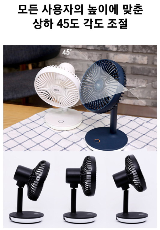 정말 신기한 기능은 탁상용 무선 선풍기인데 원터치 버튼을 2번 연속 눌러주면 선풍기가 좌우 90도로 자동 회전이 가능합니다. 상하 45도 각도 조절도 가능하여서 어느 공간에서나 사용자가 원하는 다양한 방향으로 사용할 수 있는 특징이 있습니다.