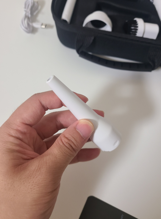 기본적으로 제품 구성은 흰색 본체와 확장노즐, 에어건 노즐, 브러시 노즐, 진공 노즐, C타입 충전 케이블과 사용설명서 등이 들어있었습니다!
