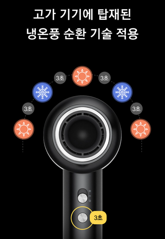 버튼을 3초간 누르면 두피와 모발을 탄력있게 만드는 냉온풍 순환 모드가 되어 모발을 케어해 손상을 최대한 줄여준다고 합니다.