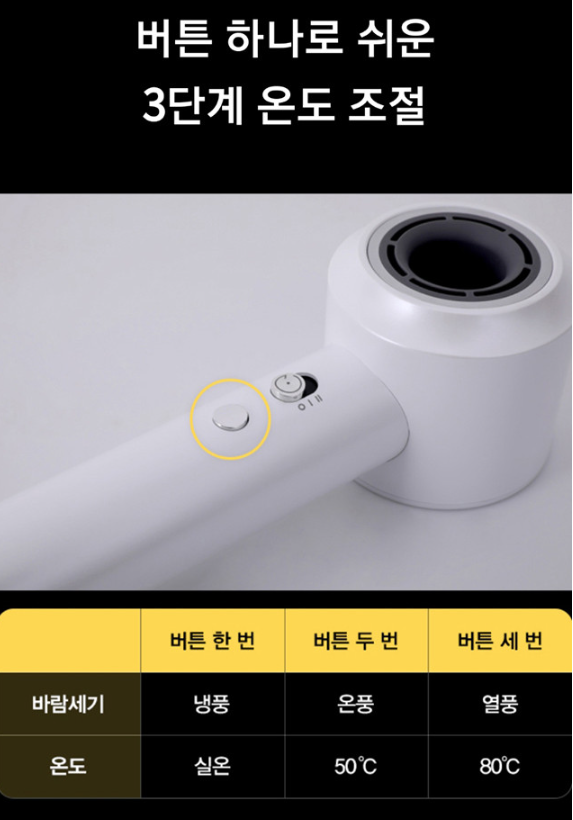 기능적인 부분도 세심하게 설계됐다는 게 느껴졌는데 버튼 하나로 3단계 온도 조절이 가능하고, 냉·온풍 순환 기술이 들어가 있어서 원하는 스타일링을 쉽게 할 수 있었습니다.