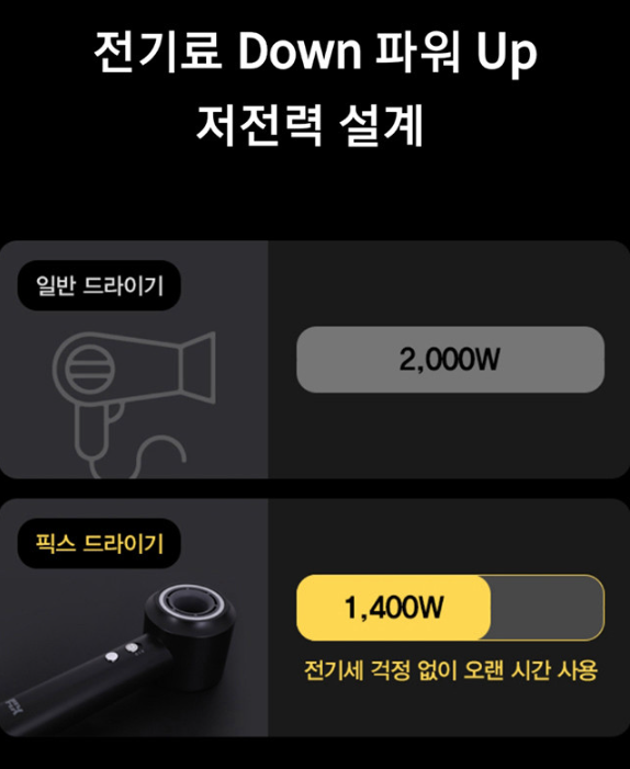 보통 2000W 이상 사용하는 드라이어기에 비해 픽스 파워소닉 드라이기는 1400W 저전력 설계로 전기세까지 효율적으로 설계되었습니다.
