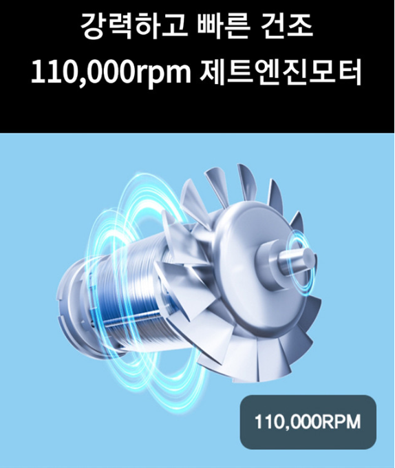110,000 rpm 제트엔진 모터에서 나오는 강력한 바람 덕분에 머리를 감고 나서 금방 마를 정도였습니다.
