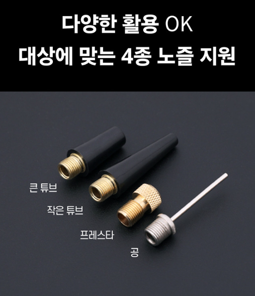 프레스타 노즐, 에어 노즐 3개가 있어서 튜브, 자전거 타이어, 공에 공기압 넣을 때 알맞게 노즐을 껴서 사용할 수 있습니다.