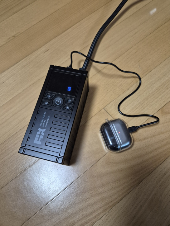 검정색으로 튼튼한 외관이었고, 공기주입튜브, 프레스타 노즐, 에어 노즐 3개, C타입 충전 케이블, 스마트 클립, 사용설명서, 전용 파우치로 구성되어 있었습니다.