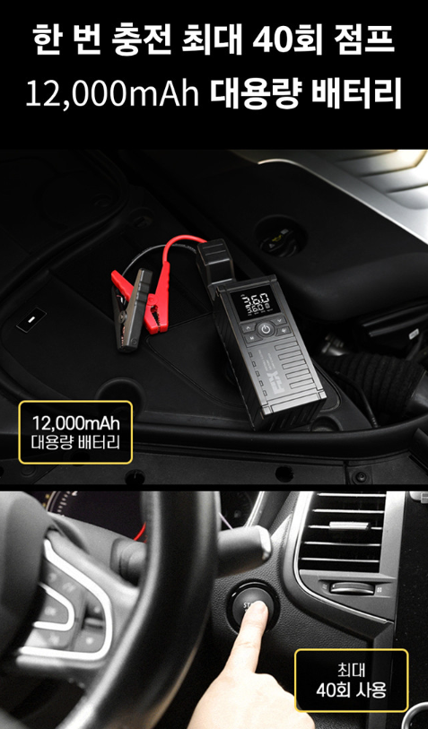 한번 충전하면 12,000mAh 대용량 배터리로 최대 40회까지 시동 복구가 가능하다고 된다고 하고,