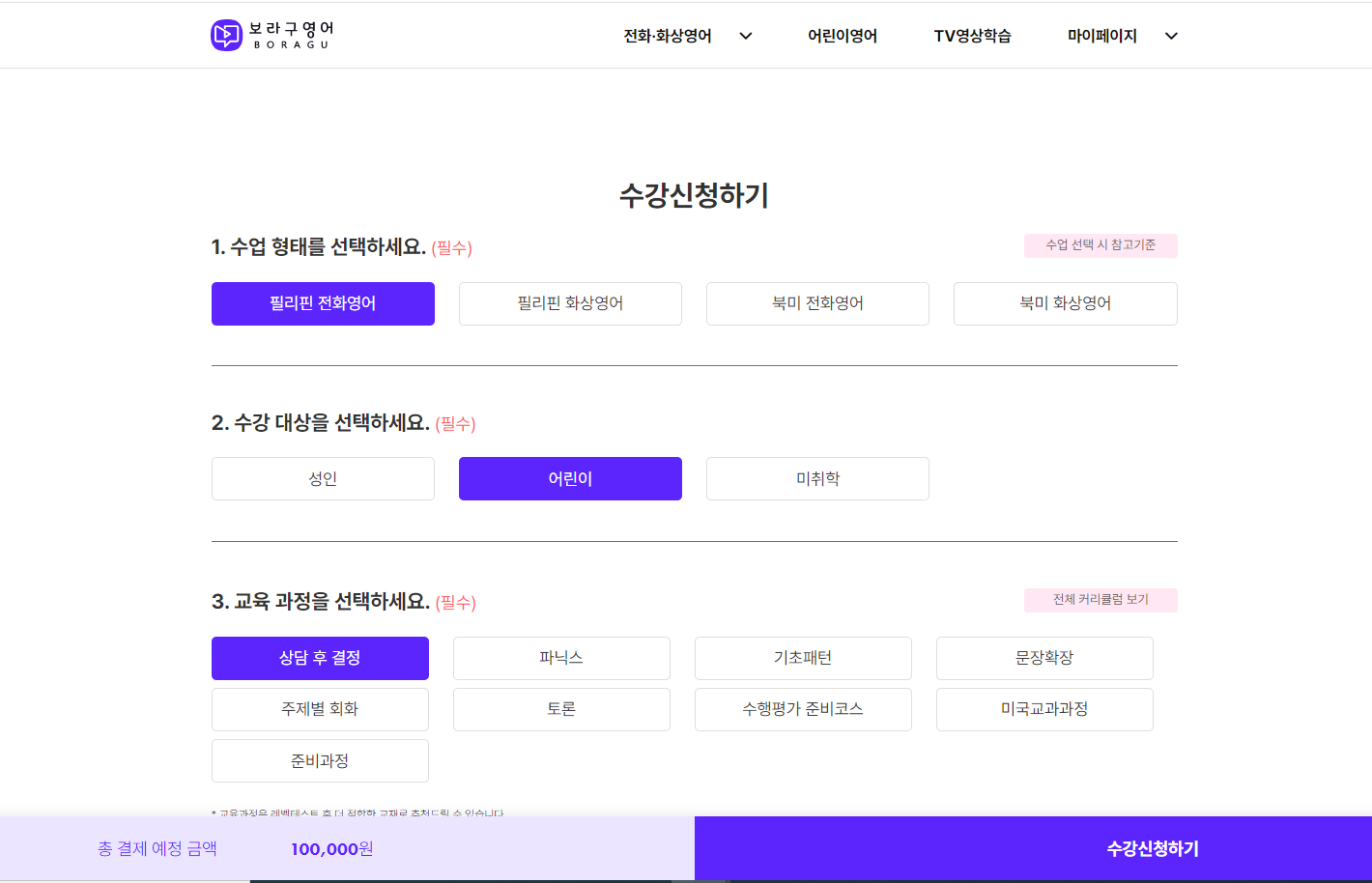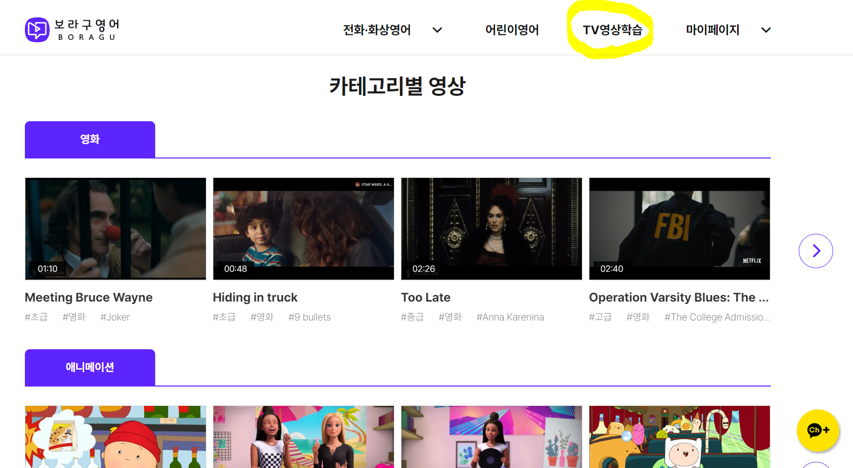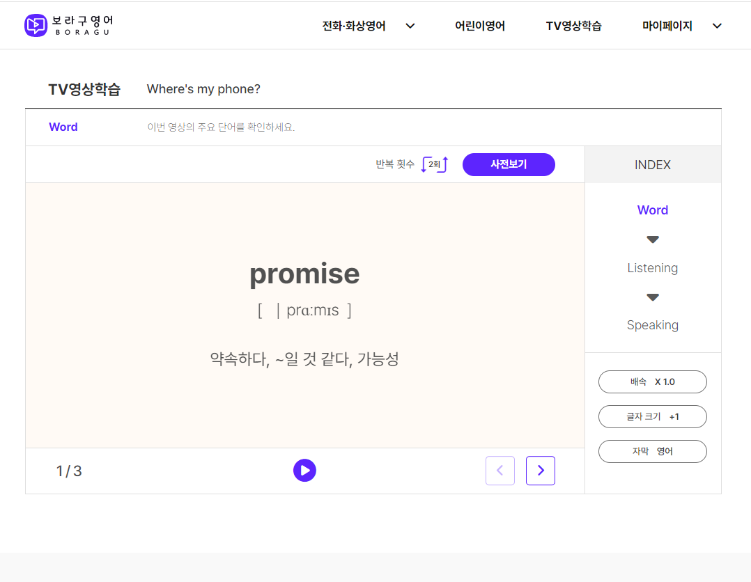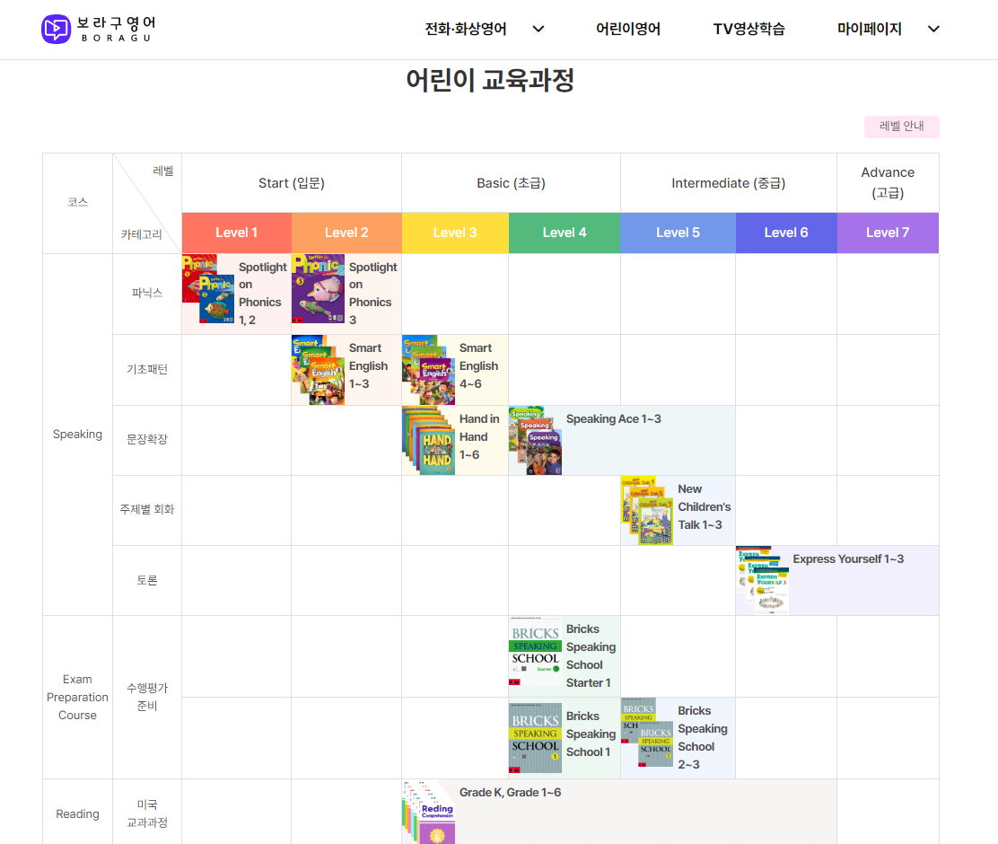 보라구 영어는 전화, 화상영어 / 어린이영어 / TV영상학습 컨텐츠가 제공되며,