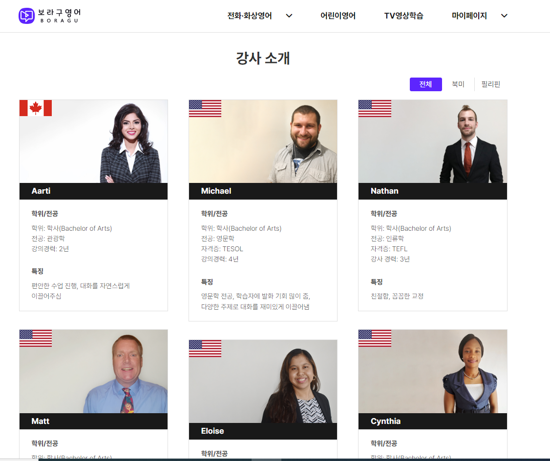 원어민 선생님들도 북미, 필리핀 등 다양한 선생님들이 계시네요!