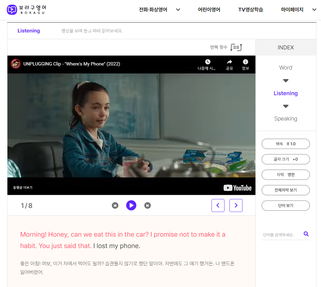 영상을 보면서 영어, 영한, 한글 등 다양한 자막형태를 선택해서 볼 수 있습니다.